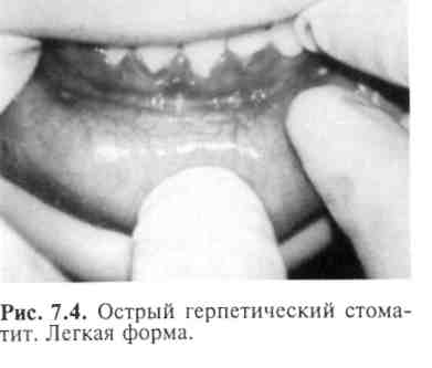 Тяжесть острого герпетического стоматита оценивается по выраженности и характеру симптомов токсикоза и симптома поражения слизистой оболочки полости рта. Легкая форма характеризуется внешним отсутствием симптомов интоксикации организма, продромальный период клинически отсутствует. Болезнь начинается как бы внезапно — с повышения температуры до 37—37,5 °С. Общее состояние ребенка вполне удовлетворительное. У ребенка иногда обнаруживаются незначительные явления воспаления слизистой оболочки носа, верхних дыхательных путей, гиперемия, небольшой отек, главным образом в области десневого края (катаральный гингивит). Длительность периода 1—2 дня. Стадия везикулы обычно просматривается родителями и врачом, так как пузырек быстро лопается и переходит в эрозию-афту. Афта — эрозия округлой или овальной формы с ровными краями и гладким дном, с ободком гиперемии вокруг. В большинстве случаев на фоне усилившейся гиперемии в полости рта появляются одиночные или сгруппированные элементы поражения, количество которых обычно не превышает 6. Высыпания одноразовые. Длительность периода развития болезни 1—2 дня (рис. 7.4).