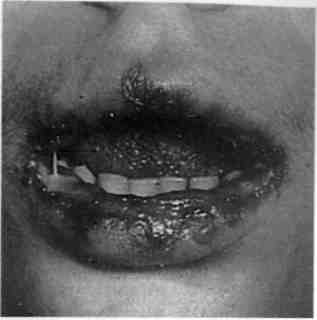 Рис. 7.20. Стрептококковые заеды. 7.8. Проявления ВИЧ-инфекции в полости рта Синдром приобретенного иммунодефицита — СПИД вызывается вирусом иммунодефицита человека (ВИЧ). Проникая в организм человека при половом контакте, через кровь, плаценту от матери к плоду, вирус поражает иммунную систему путем угнетения и уничтожения Т-лимфоцитов, что разрушает защитную систему организма от инфекции. При этом создаются условия для проявления патогенных свойств оппортунистической инфекции. Клиницисты отмечают, что проявления этой болезни в полости рта начинаются на ранних стадиях заболевания. Источник заражения — человек (больной или вирусоноситель). Многие исследователи считают, что риск передачи ВИЧ-инфекции при стоматологических манипуляциях невелик, однако врача-стоматолога причисляют к группе профессионального риска. ВОЗ рекомендует избегать прямого контакта с кровью, слюной и другими выделениями пациентов и на приеме пользоваться перчатками, маской и защитными очками.