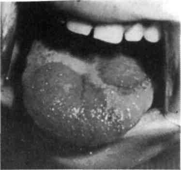 Рис. 7.9. Кандидоз. Поражение языка. Пимафуцин — один из современных полиеновых антибиотиков, его преимуществами являются отсутствие резистентности к грибам, малая токсичность и аллергизирующий эффект. Применяют его по 0,5 мл суспензии 4—6 раз в сутки или по 1 таблетке 2 раза в сутки. Азольные соединения, дающие хороший эффект в лечении кандидоза, назначают и детям. Широко используют канестен (клотримазол), низорал (1 % крем, 1 % раствор). Детям в возрасте до 3 мес препараты разводят в 2—3 раза кипяченой водой (раствор) или растительным маслом (мазь). Обязательно применение противогрибковых препаратов внутрь. Детям первых недель и месяцев жизни назначают нистатин по 100 000— 150 000 ЕД в сутки в 5—6 приемов с грудным молоком или в порошках с сахаром. Более старшим детям дают препарат из расчета 50 000 ЕД на 1 кг массы тела в сутки. Низорал показан детям с массой тела от 15 до 30 кг по 100 мг в сутки, с массой тела более 30 кг — в дозировке для взрослых. Во избежание рецидива молочницы лечение необходимо продолжать в течение 6—12 дней после полной ликвидации налета на слизистой оболочке полости рта. При рецидивирующей форме молочницы через 2 нед по окончании курса лечения рекомендуется по- вторить анализ соскоба со слизистой оболочки полости рта, чтобы убедиться в отсутствии патогенных грибов. Необходимо учитывать, что нелеченые кариозные зубы являются источником реинфекции слизистой оболочки грибами, поэтому целесообразно санирование полости рта в кратчайшие сроки. Удаление зубов показано после полного излечения кандидоза. Проявления сифилиса в полости рта. Возбудитель сифилиса — бледная трепонема — попадает в организм человека через поврежденную кожу или слизистую оболочку в результате прямого контакта или через предметы (в том числе стоматологические инструменты). Инкубационный период может длиться 3—4 нед. На месте внедрения бледной спирохеты возникает язва (шанкр) с ровными краями и дном цвета красного мяса. В основании язвы определяется инфильтрат, приподнимающий язву над поверхностью слизистой оболочки. Типичными признаками шанкра являются отсутствие болезненности при пальпации и возникновение плотных, увеличенных безболезненных регионарных лимфатических узлов, не спаянных с окружающими тканями. Диагноз должен быть подтвержден наличием в соскобе с поверхности язвы возбудителя сифилиса. При атипичном проявлении шанкра клиническая картина может быть сходной с таковой при травматических поражениях, раковой язве, шанкриформной пиодермии. Серологические реакции становятся положительными не ранее чем через 3—4 нед с момента появления сифиломы. Вторичный сифилис характеризуется полиморфной сыпью на коже и слизистых оболочках, образующей сплошные участки эритемы с резкой границей. Наиболее часто наблюдается поражение слизистой оболочки неба, язычка, миндалин, боковых поверхностей языка. Папулы при сифилисе у детей редко эрозируются. По внешним признакам папулы вторичного периода сифилиса похожи на проявления врожденного сифилиса, который может быть у ребенка первого года жизни при внутриутробном заражении сифилисом от больной матери. Папулы синюшно-красного цвета, приподняты над уровнем слизистой оболочки. На участках слизистой оболочки языка в местах образования папул выявляется отсутствие нитевидных и грибовидных сосоч
