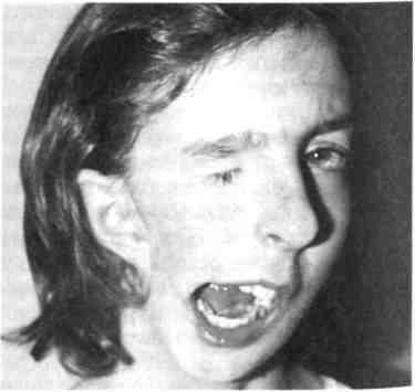 Рис. 9.2. Двусторонняя поперечная расщелина лица. вого прохода, внутреннего уха, микро- или анофтальмом. Комбинация этих признаков может быть выражена различно. Тип наследования предположительно аутосомно-доминантный. Синдром Гольденхара. Кроме перечисленных при гемифациальной микросомии пороков развития, характеризуется наличием эпибуль-барного дермоида, пороками развития шейного отдела позвоночника и мочевыводящих путей. Наружное 11Q ухо может быть развито нормально. Как правило, имеются множественные рудиментарные кожно-хряще-вые включения в мягких тканях щеки по линии срастания верхних и нижнечелюстных эмбриональных бугров (от козелка до угла рта). Тип наследования не изучен. Синдром Ван-дер-Вуда — врожденные симметричные свищи слизистых желез на нижней губе в сочетании с расщелиной верхней губы (чаще с двусторонней полной расщелиной губы, альвеолярного отростка и неба). Наследуется по аутосомно-доминантному типу с высоким уровнем риска последующего рождения ребенка с подобной патологией и, как правило, более выраженными признаками ее проявления.