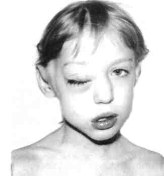 Рис. 12.13. Внешний вид больного с артериовенозными коммуникациями. ния рентгенангиоокклюзии с целью снижения скорости кровотока в опухоли, что повышает эффективность СВЧ ЭМП (рис. 12.12). Основные этапы диагностики и лечения сосудистых новообразований — гемангиом и ангиодиспла-зий — представлены в табл. 12.1. Артериовенозные коммуникации (свищи) с локализацией в мягких тканях и челюстных костях (костные формы гемангиом). Артериове- СТ нозные коммуникации (АВК) с локализацией в области верхней или нижней челюстей — это сосудистые пороки, встречающиеся нечасто и представляющие большие трудности для диагностики и лечения. Они наблюдаются у пациентов с момента рождения, однако их основные клинические проявления чаще возникают после 7—11 лет на фоне гормональной перестройки. Причиной прогрессирования порока является гемодинамическая перестройка, часто связанная с регионарной гипертензией, влияющей на окружающие ткани, в том числе на костные структуры, с образованием внутрикостных полостей. Сосудистые дисплазии верхней и нижней челюстей сопровождаются поражением не только кости, но и мягких тканей лица. В литературе описано немало случаев летального исхода в связи с массивной крово-потерей как до лечения, так и во время оперативных вмешательств на пораженной челюсти. Очень важно определение ранних признаков этой патологии. Наиболее характерными клиническими признаками АВК в области верхней или нижней челюстей в ранние сроки служат появление сла-бовыраженной припухлости мягких тканей щеки, телеангиэктазии на коже, со временем нарастающая подвижность зубов и гиперемия десне-вого края этих зубов (при этом зубы интактны), кровотечение. Кровотечение возникает либо в результате удаления патологически подвижных зубов, либо спонтанно из поддесне-вого края, а также во время прорезывания постоянных зубов. При поражении верхней челюсти часто отмечаются носовые кровотечения. При клиническом осмотре определяются увеличение тела челюсти, асимметрия лица за счет наличия артериовенозных свищей в области мягких тканей, сосудистого рисунка различной степени интенсивности (рис. 12.13) на коже или слизи- Таблнца 12.1. Основные симптомы, методы диагностики и лечения сосудистых новообразований ЧЛО в детском возрасте