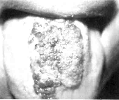 Рис. 12.19. Поверхностная лимфангиома языка. барную область появляется экзофтальм со снижением или полной потерей зрения. Как правило, наблюдаются изменения слизистой оболочки задней трети твердого и мягкого неба соответственно стороне поражения. Клинические проявления лим-фангиомы половины лица те же, что и при изолированном поражении этих областей. Вследствие длительного давления новообразования появляется вторичная деформация костей лицевого скелета, проявля- ющаяся главным образом в виде сужения зубной дуги верхней или нижней челюсти (в зависимости от локализации опухоли). Лимфангиома языка бывает поверхностной (рис. 12.19) и диффузной. Поверхностная форма подразделяется на распространенную и ограниченную, характеризуется наличием множественных мелких пузырьков на слизистой оболочке спинки языка. При распространенной поверхностной лимфангиоме языка наблюдаются пузырьковые высыпания на всей слизистой оболочке спинки языка, при ограниченной форме пузырьки сгруппированы, иногда возвышаются над окружающей неизмененной слизистой оболочкой, образуя ограниченный «узел» в средней или задней трети спинки языка. При воспалении или травме возникает кровоизлияние в пузырьки, некоторые из них лопаются, кровоточат, затем появляется белесоватый фибринозный налет. При диффузной лимфангиоме языка наблюдается поражение слизистой оболочки мышц языка, что приводит к макроглоссии различной степени выраженности. Возможно одностороннее поражение, четко ограниченное срединной бороздой, но чаще бывает поражение всего языка. Язык увеличен, передняя треть его колбообразно утолщена. При выраженной макроглоссии язык не умещается в полости рта, выступает между зубами и губами, губы сомкнуты с напряжением или рот вынужденно открыт. Изменения на слизистой оболочке при диффузной лимфангиоме языка типичны и аналогичны признакам поверхностной лимфангиомы. Koj личество пузырьков на слизистой оболочке языка может быть различным и нестабильным. Пузырьковые высыпания на слизистой оболочке не всегда появляются одновременно с обнаружением макроглоссии, могут впервые возникать при воспалении лимфангиомы, после травмы или операции (частичной резекции языка). Диффузная лимфангиома языка с выраженной макро-глоссией всегда приводит к формированию открытого прикуса с контактом зубов-антагонистов в области моляров, а иногда и с полным отсутствием контакта зубов верхней и нижней челюстей. У этих детей наблюдаются чрезмерное развитие подбородочного отдела нижней челюсти, увеличение угла между ветвью и телом, удлинение переднего отдела нижней челюсти. Нарушение прикуса и макроглоссия вызывают функциональные нарушения жевания, дыхания, речи. Проявления лимфангиомы шеи не отличаются большим разнообразием и зависят от морфологической структуры опухоли. При кавернозной форме определяется тестоватая припухлость мягких тканей без четких границ, со сглаженностью естественных складок. Кожные покровы обычной окраски, неподвижны над новообразованием, возможна выраженность сосудистого рисунка подкожных вен (при атрофии подкожной клетчатки). При кистозной или кистозно-ка-вернозной форме опухоли припухлость мягких тканей относительно ограничена, округлой или овальной формы, несколько контурируется и выбухает кнаружи. Кожные покровы над