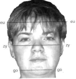 Рис. 13.12. Измерение ширины головы (ей—ей), морфологической ширины лица (zy—zy), гениальной ширины лица (go—go). Точки костной основы обозначают заглавными буквами, а точки мягких тканей — строчными.