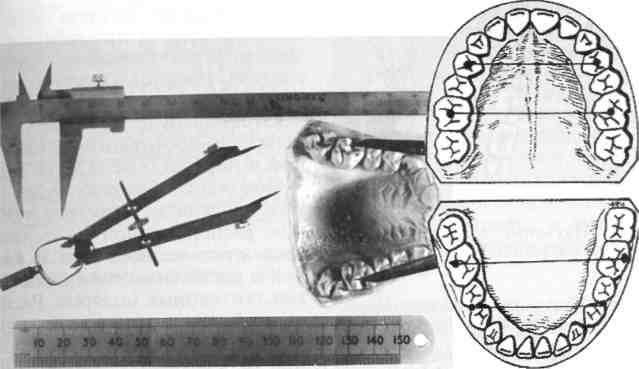 Измерения зубных рядов проводят в трансверсальном (поперечном) и сагиттальном (продольном) направлениях. В трансверсальном направлении изучают ширину, в сагиттальном — длину зубных рядов. Трансверсальные размеры зубных рядов. У детей в период прикуса молочных зубов З.И. Долгополова (1973) предложила измерять ширину зубных рядов на верхней и нижней челюстях между центральными и боковыми резцами, клыками, первыми и вторыми молочными молярами. Измерительные точки у центральных и боковых резцов и клыков расположены на вершинах зубных бугорков, у первых и вторых молочных моляров — на жевательных поверхностях в переднем углублении на месте пересечения продольной и поперечной борозд. В период прикуса постоянных зубов для определения трансверсаль-ных размеров зубных рядов используют методику Пона, которая основана на зависимости между суммой мезиодистальных размеров 4 верх- них резцов и расстоянием между первыми премолярами и первыми молярами на верхней и нижней челюстях. С этой целью Пон предложил точки измерения, которые при смыкании зубов верхней и нижней челюстей совпадают, и, следовательно, ширина их зубных рядов одинакова. В области первых премоляров ширину зубного ряда, согласно По-ну, измеряют на верхней челюсти между точками в середине межбуг-ровой фиссуры, на нижней челюсти между дистальными контактными точками на скате щечных бугров. В области первых постоянных моляров ширину зубного ряда определяют на верхней челюсти между точками в передних углублениях продольной фиссуры, на нижней челюсти между задними щечными буграми (рис. 13.17). В период смены зубов вместо измерительных точек на премолярах используют дистальные ямочки первых молочных моляров на верхней челюсти или их задние щечные Рис. 13.17. Измерительные точки Пона и измерение зубных рядов. бугры на нижней челюсти. Кроме ширины зубных рядов в области премоляров и моляров, целесообразно изучать ширину зубных рядов в области клыков между вершинами их режущих краев. Сагиттальные размеры зубных рядов у детей определяют в возрасте от 3 до 6—7 лет (в период прикуса молочных зубов). Длину переднего отрезка зубного ряда измеряют от середины расстояния между мезиальными углами центральных резцов с их вестибулярной поверхности по сагиттальной плоскости до точки пересечения с линией, соединяющей дистальные поверхности коронок молочных клыков, общую же сагиттальную длину зубного ряда — до точки пересечения с линией, соединяющей дистальные поверхности вторых молочных моляров (рис. 13.18). Измеряют также лонгитудиналь-ную длину зубных рядов, которая в норме равна сумме мезиодистальных размеров 12 зубов. Симметричность зубных рядов и смещение боковых зубов исследуют путем сопоставления размеров правой и левой половин зубного ряда и определения одностороннего мези-