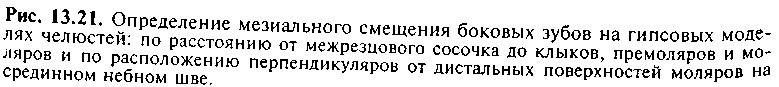 Рис. 13.20. Изучение симметричности зубных рядов по методике Fuss. центральных резцов и точками Пона (рис. 13.20). Смещение боковых зубов мези-ально на гипсовых моделях челюстей можно определить, сравнивая расстояния от межрезцового сосоч- ка до вершин клыков или точек Пона на первых премолярах и первых молярах справа и слева. На стороне предполагаемого мезиаль-ного смешения боковых зубов это расстояние будет меньше по сравнению с противоположной стороной и нормой (рис. 13.21). Положение боковых зубов можно также оценить относительно точки «О», расположенной на пересечении срединного небного шва и касательной к дистальным поверхностям первых постоянных моляров. Расстояние от этой точки до измерительных точек Пона на первых премолярах (линия б) и первых моляров (линия а), а также расстояние по срединному небному шву от точки «О» до вершины межрезцового сосочка. Расстояние от точки «О» до измерительных точек справа и слева должно быть равным (рис. 13.22). Необходимо исследовать сегменты зубных рядов, небный свод. Значения параметров небного свода (длину, высоту, ширину и угол неба) определяют по следующей методике: • длину небного свода — от вершины межрезцового сосочка (латеральные аппроксимальные поверхности центральных резцов) по срединному небному шву до линии, соединяющей дистальные поверхности первых постоянных моляров;