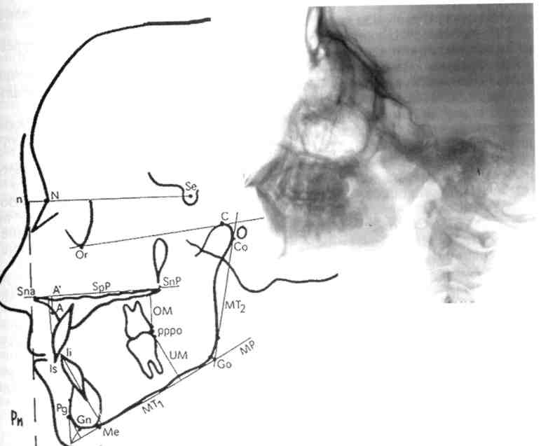 Рис. 13.29. Скопированная телерентгено нему прикрепляют кальку, на которую переносят изображение. ТРГ по методу Шварца позволяет наиболее полно изучить размер и положение челюстных костей. Пользуясь этим методом, можно провести краниометрические, гна-тометрические и профилометриче-ские измерения. С помощью краниометрии определяют: 1) расположение челюстей в сагиттальном и вертикальном направлениях по отношению к плоскости передней части основания черепа; 2) расположение ВНЧС по отношению к плоскости передней части основания черепа; 3) длину передней части основания черепной ямки. Для анализа ТРГ используют следующие точки плоскости: \ — субспинальную точку Downs, наиболее глубокую на переднем контуре апикального базиса верхней челюсти; 3 — супраментальную точку Downs, наиболее дистально расположенную на переднем pg — самую переднюю точку подбородочного выступа; р^§е _- плоскость переднего отдела основания черепа (ее проводят через точки N и Se); gpP _ плоскость основания верхней челюсти (проходит через точки Sna и Snp); рп — носовая вертикаль, которую проводят перпендикулярно к плоскости NSe через кожную точку п; MP — плоскость основания нижней челюсти. На ТРГ отделяют краниальную часть черепа от гнатической плоскости верхней челюсти (SpP). Варианты расположения челюстей определяют по лицевому, инклина-ционному углу и углу горизонтали: 1) лицевой угол. F образуется при пересечении линий N—Se и N—А (внутренний нижний угол). Его величина характеризует расположение верхней челюсти по отношению к основанию черепа в сагиттальном направлении. Угол меньше нормы характерен для ретрогнатии, больше нормы — для прогнатии; если он находится в пределах нормы, говорят о нормогнатии; 2) угол горизонтали Н образуется при пересечении линии Н (горизонтальная линия) и Рп (внутренний верхний угол) и определяет положение суставной головки нижней челюсти по отношению к основанию черепа, что влияет на форму профиля лица; 3) инклинационный угол J образуется при пересечении линий Рп и SpP (внутренний верхний угол). Если угол J больше средней величины, то челюсти наклонены вперед, что Шварц назвал антеинкли-нацией. Если угол меньше средней величины, то челюсти отклонены назад. Такое положение челюстей называется ретроинклинацией. Гнатометрический метод (по Шварцу) позволяет: