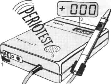 одонтодиагностику, гнатодинамо-метрию, периотестометрию, реопа-родонтографию. Наиболее информативным методом диагностики является периотестометрия, которую можно проводить с помощью компактного прибора «Периотест», состоящего из двух частей: приборного блока компьютерного анализа и наконечника, соединенных между собой кабелем (рис. 13.33). Компьютерный анализатор включает в себя источник питания, 4 микропроцессора, логические схемы сравнения. Два микропроцессора служат для обработки информации, 3-й — содержит программу управления, в 4-й заложена речевая программа. Программа аппарата предусматривает автоматическое перкутирование коронки зуба 16 раз (со скоростью 4 удара в секунду). Результаты измерения выдаются в звуковом виде и в виде цифровой информации на дисплее. При каждом измерительном импульсе аппарат издает короткий звуковой сигнал, а после окончания измерения следует длинный звуковой сигнал. Затем на цифровом индикаторе появляется соответствующий индекс, который сопровождается звуковой речевой информацией.