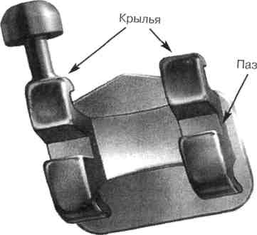 Рис. 13.49. Конструкция брекета. лочной ортодонтической дуги на зубы. Конструкция брекета эджуайз-техники состоит из следующих элементов (рис. 13.49): • паза, располагаемого на лицевой поверхности замкового приспособления; • крыльев, за счет которых проводится фиксация проволочных ор-тодонтических дуг с помощью проволочной или эластичной лигатуры; • опорной площадки, посредством которой брекет фиксируется на клинической коронке зуба. До появления в стоматологии клеевых композитных материалов брекеты приваривали или припаивали к вестибулярной поверхности ортодонтических колец с последую-