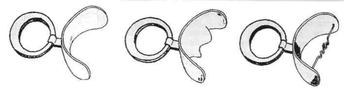 Рис. 13.42. Протрагирующая дуга. В основе действия пружинящих элементов заложен принцип «английской булавки», что позволяет добиться непрерывного продолжительного действия. К пружинящим элементам относятся также рукооб-разные пружины, позволяющие перемещать зубы по зубному ряду в дистальном и мезиальном направлениях. Причем, если зуб необходимо переместить в дистальном направлении, пружина охватывает зуб с мезиальной аппроксимальной поверхности, в случае мезиального перемещения — наоборот. К опорным элементам лечебных аппаратов относятся всевозможные виды ортодонтических кламмеров. Кламмер состоит из отростка, тела и плеча. Отросток кламмера вваривается в базис аппарата, переходит в тело кламмера, а последний — в плечо. Плечо располагается на вестибулярной поверхности зуба между шейкой и экватором зуба. Рабочим элементом кламмера является отрезок проволоки, расположенный между телом и плечом. При его активации можно регулировать степень фиксации кламмера. Кламмеры могут быть изогнутыми, литыми, ленточными, а также пуговча-тыми. Они располагаются между зубами, а их «пуговка» — с вестибулярной стороны. В зависимости от вида конструкции различают круглый кламмер, кламмер Адамса, стреловидный кламмер Шварца, многозвеньевой кламмер. Наиболее часто использу-