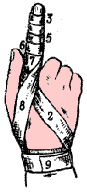 3. Наложить повязку на палец. Спиральная повязка на палец начинается круговым ходом на запястье. Отсюда бинт ведут по тылу кисти к концу пальца, от которого делают спиральные ходы до основания пальца; заканчивают повязку косым ходом по тылу кисти на запястье, где и закрепляют. Спиральную повязку можно наложить на каждый палец в виде перчатки. При этом на левой ручке начинают бинтовать с мизинца, а на правой - с большого пальца.