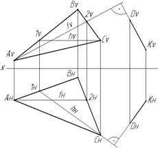 Рис. 3.10. Перпендикулярность прямой к плоскости Решение. В плоскости треугольника провести фронталь и горизонталь. Построить фронтальную проекцию прямой KD (КvDv) перпендикулярно к фронтальной проекции фронтали плоскости (Аv2v), а горизонтальную проекцию прямой (KнDн) перпендикулярно проекции горизонтали (Сн1н). Задача: Определить расстояние от точки А до заданной плоскости (Рис.3.11). Решение. Чтобы найти расстояние от точки до плоскости, нужно из точки опустить перпендикуляр на плоскость, найти точку пересечения этого перпендикуляра с плоскостью и определить его натуральную величину.