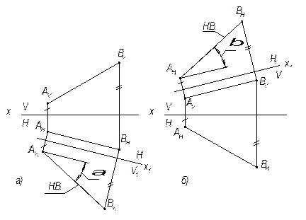 Рис 4.3. Преобразование чертежа прямой Решение. Новая плоскость V1 перпендикулярна плоскости H и АНВН. Расстояния от точек АV1 и ВV1 до новой оси Х1 на плоскости V1 равно расстоянию от точек АV и ВV до старой оси Х. Задача: Определить натуральную величину и угол наклона отрезка АВ прямой общего положения к плоскости H и V. (рис.4.4а, б).
