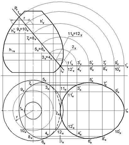 Рис. 7.3. Сечение поверхности вращения плоскостью P 1 и 2 - высшая и низшая точки, а также самая левая и самая правая точки (экстремальные точки). Они расположены на главном меридиане поверхности Ф, поэтому горизонтальные проекции этих точек 1Н и 2Н находят по линии связи на горизонтальной проекции главного меридиана. 3 и 4- самая близкая и самая удаленная точки (точки видимости). Они расположены на экваторе поверхности Ф, поэтому горизонтальные проекции этих точек 3Н и 4Н находят по линиям связи на горизонтальной проекции экватора. Для построения линии пересечения недостаточно этих точек, поэтому находят еще ряд произвольных точек. Для нахождения горизонтальных проекций произвольных точек 5; 6; 7 и т.д. можно воспользоваться окружностями - параллелями hÈ и hÈÈ, взятыми наповерхностивращения Ф и проходящими через эти точки. Горизонтальные проекции точек 9;10; 7; 8 находят на линии связи на соответствующих проекциях окружностей – параллелей h¢Н и h²Н. Полученные проекции точек соединяют плавной кривой с учетомвидимости. Видимость линии пересечения на горизонтальной проекции определяют точки 3 и 4, расположенные на экваторе поверхности Ф. Часть линии пересечения {3Н,5Н,7Н,1Н,8Н,6Н,4Н} видима, т. к. расположена выше экватора, другая часть линии пересечения {3Н, 2Н, 4Н} – невидима. На фронтальной проекции видимая и невидимая часть линии пересечения совпадают. Натуральная величина сечения определена способом вращения вокруг проецирующей оси.