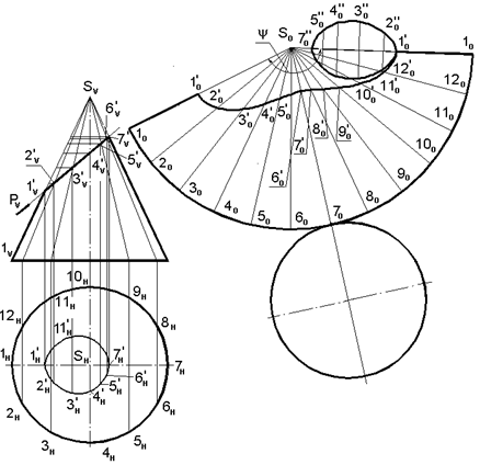 Рис. 7.20. Развертка усеченного конуса Из произвольной точки SО проводится окружность радиусом SV1V, на которой откладываются 12 равных отрезков: 1020=1H2H; 2030=2H3H и т.д. Точки 10, 20, 30 и т.д. соединяются с точкой SО и на этих прямых линиях отмечаются точки 1’0, 2’0, 3’0 и т.д. на расстояниях SО1’0= SV1’V; SО2’0 = SV2’’V; SО3’0 = SV3’’V и т.д. Полученные точки плавно соединяют линией, которая представляет собой линию сечения конуса плоскостью Р. Развертка конуса включает в себя также круг основания конуса и эллипс (сечение конуса плоскостью Р), который может быть построен так, как показано на рис.6.6 или по двум осям (большая ось эллипса равна отрезку 1’V7’V, а малая расположена посередине между точками 1V и 7V). С построением развертки боковой поверхности усеченного конуса, поверхности сферы и тора можно ознакомится по литературе /1/ и /2/.