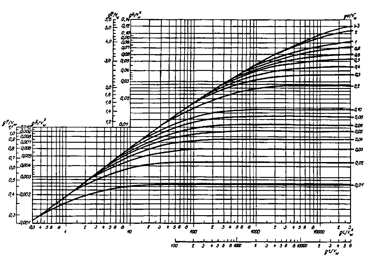 Определение элементов волн в глубоководном и мелководном бассейнах (акваториях). Средние высота Определение величин После установления типа волнения (установившегося или развивающегося) на соответствующей кривой с полученным значением gH/W находится точка gt/W или gD/W2 . Далее находятся ординаты этой точки на левых осях (условно смещённых). По найденным значениям Средняя длина волн