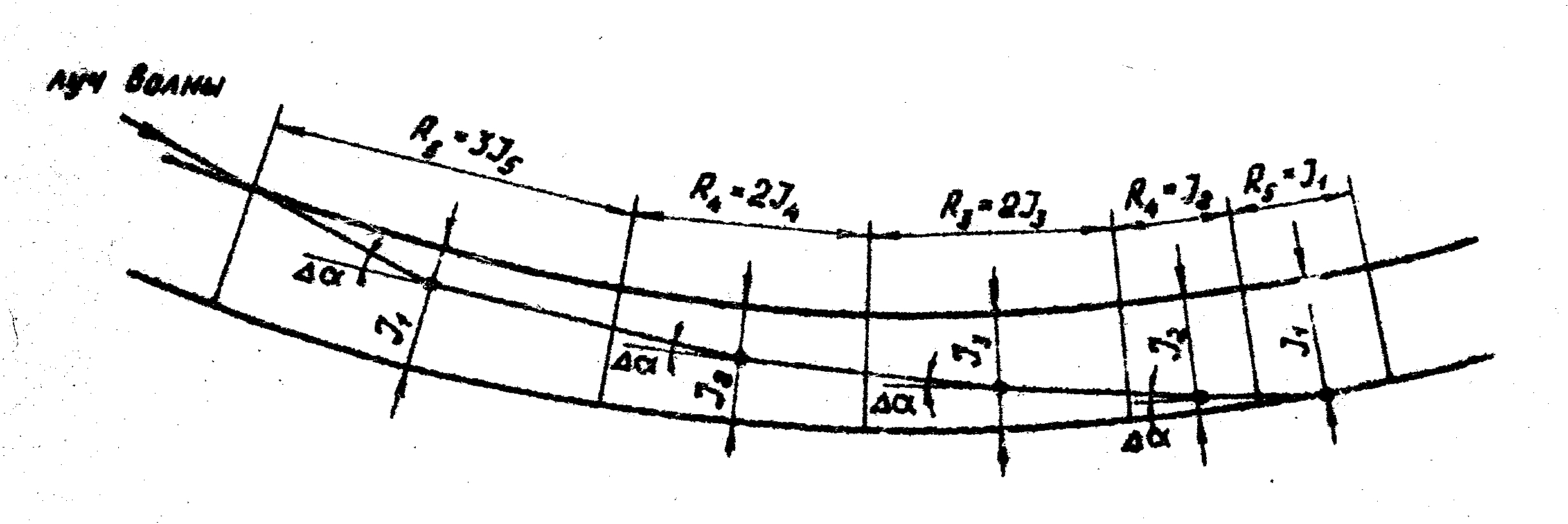 где kr – коэффициент трансформации волны; Высота исходной i %-ной обеспеченности Коэффициент трансформации Коэффициент рефракции Пример построения плана рефракции показан на рис. 2.6. Предварительно на план акватории наносятся параллельные друг другу лучи исходных волн (расстояния между лучами принимаются равными (1÷2) Построение производится до границы проектируемого сооружения, но не далее границы прибойной зоны. В случае, если луч волны и изобаты почти параллельны (α>80°), то вышеизложенный метод неприемлем, так как резко снижается точность построения. Порядок определения углов поворота D αi луча волны в этом случае следующий. Интервал между изобатами делится поперечными линиями на ряд отсеков (рис. 2.7). Расстояния между границами отсеков R берутся кратными расстоянию между изобатами J в этом отсеке. Далее определяются скорости гребней волны на рассматриваемых изобатах по формуле: