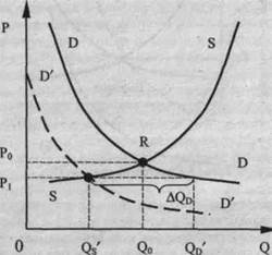 Всем желающим купить товар по цене Р, его не хватает. Возникнет конкуренция среди покупателей, выражающаяся в очередях, ограниченном потреблении и др. Цена вскоре пойдет вверх, так как в ситуации дефицита покупатели готовы заплатить и более высокую цену за товар, лишь бы получить товар, которого для всех желающих не хватает при этой цене. Рост цены будет продолжаться до тех пор, пока не установится равновесие, т.е. пока AQD = 0. Равновесие на рынке может быть достигнуто и другим путем: сокращением в целом спроса на данный товар (сдвиг кривой спроса влево, в положение D'D')- Если реальная рыночная цена (Р,) выше равновесной (Р0) (рис. 15), то объем спроса составит величину QD', а объем пред- Есть, однако, и другой путь, благодаря которому установится равновесие, но на новом уровне, - уменьшить все предложения (сдвиг кривой SS влево в положение S'S')- Мы уже знакомились с факторами, оказывающими воздействие на предложение в целом (см. раздел 1.4). Рыночное равновесие может нарушаться вследствие изменения вкусов и предпочтений потребителей, их доходов, технологии производства товаров, цен на другие товары и т.д. (т.е. детерминанты спроса и предложения сдвигают кривую спроса и кривую предложения). В результате под воздействием рыночного механизма (действие законов спроса, предложения и конкуренции) устанавливаются новые равновесные параметры (Р0 и Q0). Если отклонение от равновесного состояния приводит к возвращению в это же состояние, то такое равновесие является стабильным. Неустойчивое равновесие — это такое состоя-
