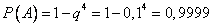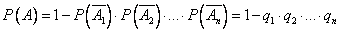 Искомая вероятность Пример. В типографии имеется 4 плоскопечатных машины. Для каждой машины вероятность того, что она работает в данный момент, равна 0,9. Найти вероятность того, что в данный момент работает хотя бы одна машина (событие А). Решение. События "машина работает" и "машина не работает" (в данный момент) — противоположные, поэтому сумма их вероятностей равна единице: Отсюда вероятность того, что машина в данный момент не работает, равна Искомая вероятность Так как полученная вероятность весьма близка к единице, то на основании следствия из принципа практической невозможности маловероятных событий мы вправе заключить, что в данный момент работает хотя бы одна из машин. Пример. Вероятность того, что при одном выстреле стрелок попадает в цель, равна 0,4. Сколько выстрелов должен произвести стрелок, чтобы с вероятностью не менее 0,9 он попал в цель хотя бы один раз? Решение. Обозначим через А событие "при n выстрелах стрелок попадает в цель хотя бы один раз". События, состоящие в попадании в цель при первом, втором выстрелах и т. д., независимы в совокупности, поэтому применима формула Приняв во внимание, что, по условию,