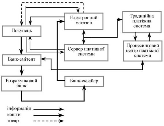 Кредитні Internet-системи є електронними аналогами звичайних систем, що працюють з кредитними картками. Проте, оскільки всі трансакції здійснюються через мережу Internet, то це потребує додаткових засобів безпеки та автентифікації. Такими засобами є кредитні картки та банкомати. Кредитна картка - банківська платіжна картка, яка свідчить, що її власнику відкритий кредит в банку. Банкомат - електронно-механічний пристрій, що дає можливість власнику банківської платіжної картки при введені персонального ідентифікаційного номера (РIN-коду) отримувати готівку. Процес здійснення платежів з використанням кредитної системи подано на рис. 6.1.