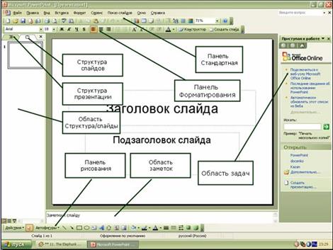 В режиме Структура в этой области отображается иерархическая структура, содержащая заголовки и тексты слайдов презентации. Перед заголовком каждого слайда стоит номер и значок. Основной текст, включающий до пяти уровней отступов, расположен после каждого заголовка. В центре приложения находится область слайда, в которой отображается слайд. Режим обычный - это основной режим для создания, редактирования и форматирования отдельных слайдов. Ниже главного окна находится область заметок. В этой области к каждому слайду можно добавить заметки докладчика, которые не отображаются в режиме показа слайдов. Строка меню предоставляет доступ ко всем важным командам программы PowerPoint. Панели инструментов предоставляют быстрый доступ к используемым командам. В PowerPoint используется группа команд меню П оказ слайдов вместо меню Таблица редактора Word. На панели форматирования размещены следующие инструменты: Конструктор и Создать слайд. При выборе кнопки Конструктор в области задач отображается панель Дизайн слайда, в которой размещены три раздела: Шаблоны оформления; Цветовые схемы; Эффекты анимации. С помощью команд этих разделов можно к слайду применить шаблон оформления, цветовые схемы и эффекты анимации. При выборе на панели инструментов команды Создать слайд, в области задач отображается панель Разметка слайда, с помощью которой можно изменять разметку слайдов (Макет текста, Макет содержимого, Макет текста и содержимого). Бегунок линии прокрутки позволяет переходить между слайдами, а не по тексту в пределах одного слайда. Кроме того, во время перетаскивания бегунка редактор показывает номер и название каждого слайда. Кнопки режима просмотра слева от горизонтальной полосы прокрутки, позволяют быстро переключиться в один из режимов просмотра PowerPoint (Обычный режим, Режим сортировщика слайдов, Показ слайдов). В левой части строки состояния отображается номер слайда, над которым идет работа в данный момент, и тип создаваемой презентации. Режимы просмотра: Для эффективного применения PowerPoint при создании и редактировании презентаций необходимо использовать различные режимы просмотра документов. Режимы представляют собой разные способы отображения слайдов на экране. К основным режимам, применяемым в PowerPoint, относятся: обычный режим и режим сортировщика слайдов. Переключение режимов отображения можно осуществлять в меню Вид (Обычный, Сортировщик слайдов, Показ слайдов, Страницы заметок). Переключение режимов можно также осуществлять с помощью кнопок, расположенных слева от горизонтальной полосы прокрутки (Обычный режим, Режим сортировщика слайдов, Показ слайдов). Режимы отображения слайдов: Режим «Обычный». В этом режиме в окне приложения отображаются три области: Структура-Слайды; область Слайда; Заметки к слайду. Размеры областей можно изменять, перетаскивая их границы. Режим «Сортировщик слайдов» – это режим, в котором все слайды презентации отображаются виде миниатюр. В этом режиме можно легко перемещать слайды, изменяя порядок их следования в презентации. Режим «Показ слайдов» - это режим, с помощью которого можно просмотреть презентацию на экране. Режим «Страницы заметок» – режим просмотра, в котором к каждому из слайдов можно добавить заметки докладчика. В верхней половине страницы появляется уменьшенное изображение 