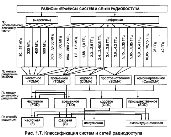 Для классификации систем радиодоступа по диапазону частот важнейшее значение имеет национальное распределение полос частот. В России национальное распределение частот определяется Таблицей распределения полос частот. Для аналоговых средств радиодоступа первого поколения используется частотное разделение каналов, в сочетании с частотным разделением дуплексных каналов и частотной модуляцией. Для цифровых систем следующих поколений во всех диапазонах частот допустимы методы частотного, временного, кодового, пространственного разделения каналов и их комбинаций. При разделении каналов каждый абонент использует только свой сигнал. Обмен информацией осуществляется по прямому и обратному каналам. Их разделение не позволяет наложиться сигналам, передаваемым в разных направлениях по дуплексному каналу и одновременно выполнять передачу и прием информации. К традиционным методам разделения дуплексных каналов относятся методы частотного, временного и кодового разделения. По аналогии с методами разделения каналов можно предположить, что появится пространственное разделение и комбинированное, использование нескольких перечисленных методов разделения дуплексных каналов. Важнейшими для систем радиодоступа параметрами, определяющими скорость передачи информации при заданной полосе частот, являются методы модуляции сигналов. Именно развитие последних знаменует переход от поколения к поколению. Однако в классификации на рис. 1.7 ограничимся основными методами модуляции сигналов: частотная (F), фазовая (G), амплитудно-фазовая и ее разновидность — квадратурная модуляция, импульсная модуляция. Date: 2015-07-01; view: 486; Нарушение авторских прав |