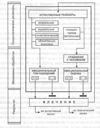Результатом воздействия естественных релизеров на те или иные органы чувств являются ощущения. Ощущение «есть действитель- но непосредственная связь сознания с внешним миром, есть превращение энергии внешнего раздражителя в факт сознания» (Психология. Словарь, 1990, с. 261). Поэтому классификация естественных релизеров, в целом, соответствует классификации модальности экстероцептивных ощущений: зрительные, слуховые, осязательные и т.д.). Переживание воздействия релизеров сопровождается эмоциональным тоном ощущений. При этом положительный эмоциональный тон побуждает человека к его сохранению и продолжению, т.е. к контакту с природными объектами, обеспечивающими соответствующие стимулы, а отрицательный — обусловливает их избегание (Психологический словарь, 1983, с. 412). Таким образом, ощущения выступают в процессе развития отношения к данному природному объекту в качестве своеобразного «фильтра»: отрицательные могут «блокировать» дальнейшие контакты с этим существом, в то время как положительные -стимулируют пролонгацию контактов с объектом, их вызвавшим, закладывают основу для формирования субъектно-этического типа отношения к нему. Несколько иначе обстоит дело с поведенческими (витальными) релизерами: получаемые ощущения уже не играют сами по себе принципиальной роли. Ведущим механизмом становятся эмоции, возникающие при оценке определенного поведения, витальных проявлений природного объекта в контексте социально выработанных значений, стереотипов, человеческих этических норм и т.д. Природные объекты, обеспечивающие релизеры, вызывающие положительные ощущения и эмоции, становятся привлекательными для человека. Н.Н.Обозов подчеркивает, что «привлекательность — первая фаза установления отношений. Привлекательность регулируется опытом прошлых контактов личности, визуальным обликом партнера (т.е. комплексом релизеров. — В.Я.). Она является внутренним стимулом для установления отношений... устойчивое переживание позитивных установок по отношению к привлекательности личности переходит в готовность к определенному типу взаимодействия с ней» (1981, с. 85). Такие природные объекты, обеспечивающие положительные релизеры, становятся аттрактивными для человека. Наши действия, направленные на эти существа, это «результат... специфического эмоционального отношения, оценка которого порождает разнообразную гамму чувств (от неприязни до симпатии и даже любви) и проявляется в виде особой социальной установки» (Психология. Сло-в«Ръ, 1990, с. 31).