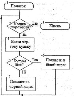 Наприклад, необхідно розкласти білі і чорні кульки, які знаходяться в кошику відповідно в білий і чорний кошики. Алгоритм виконання.цієї задачі для виконавця-робота буде мати такий вигляд, як зображено на малюнку. В цьому алгоритмі використовуються три види блоків (всіх можливих блоків біля 20): «Початок» і «Кінець» -блоки 1 і 3; вказівка «Виконати» дію - блоки 4, 6, 7; вказівка «Перевірити» задану умову і вибрати один з двох напрямків залежно від того виконується (Так) або не виконується (Ні) умова - блоки 2 і 5. Базові структури алгоритмів Слідування - вказівка подається у вигляді послідовності двох Розгалуження - використовується для вибору напрямку подальшої роботи залежно від виконання або невиконання заданої умови. Наприклад, «буде дощ, так: взяти парасольку, ні: не брати парасольку»; «набрав прохідний бал, так: поступив, ні: не поступив». Повторення - використовуються, коли доводиться одну й ту саму дію або послідовність дій виконувати кілька разів. Приклад алгоритму повторення: «Бити молотком цвях, поки його шляпка не зрівняється з поверхнею дошки». Типи виразів В інформаційних технологіях (починаючи від програмування і закінчуючи телекомунікаціями) широко використовуються три основних типи виразів: арифметичні, умовні і логічні. Значення виразу буде числовим (для арифметичного виразу) або логічним (для умовного або логічного виразів). Арифметичний вираз - це звичайна формула, операндами якої можуть бути числа, змінні і функції. Наприклад, b2 - 4ас -арифметичний вираз. В комп'ютерних технологіях для позначення арифметичних операцій використовуються знаки: «+» (додавання), «-» (віднімання), «*» (множення), «/» (ділення), «**» або «^» (степінь). Наприклад, в програмі Excel для обчислення дискримінанту треба написати =b^2 - 4*а*с. Значенням арифметичного виразу може бути будь-яке дійсне число. Умовний вираз - це вислів про значення операндів, який може бути істинним або хибним. Наприклад, якщо змінна в момент висловлювання має значення 6, то вислів 2<а є істинним, а вислів а>15 - хибний. Результатом умовного виразу є логічне (булеве) дане, яке може набувати лише два значення - «Так» або «Ні» (інші формулювання: «Истина» або «Ложь», «true» або «false», 1 або 0). Операндами умовного виразу можуть бути числа, змінні, функції та рядки символів, з'єднані між собою знаками відношення: «=» (дорівнює), «о» (не дорівнює), «>» (більше), «<» (менше) тощо. Умовний вираз - це лише представник логічного виразу. Логічний вираз - це складний вислів про значення декількох умовних виразів. Операндами логічного виразу можуть бути умовні вирази, які з'єднані знаками логічних операцій AND або OR («I» або «АБО», «И» або «ИЛИ»). Логічний вираз (так як і умовний) може набувати лише булеве значення. Наприклад, вираз d > 5 AND а <2 буде істинним, якщо одночасно два відношення d > 5 та а <2 будуть істинними. Вираз d > 5 OR a <2 буде істинним, якщо хоча б одне із двох відношень буде істинним. В електронних таблицях, інформаційних системах, мовах програмування широко застосовуються також символьні вирази, операндами яких є рядки символів. Для них використовується лише одна арифметична операція - конкатенація (з'єднування). Знак цієї операції «+», а результат операції - новий рядок символів. Рядки символів записуються в лапках «"» або апострофах «'». Пропуск -це рівноправний знак символьного рядка. Наприклад, "дорога життя