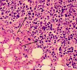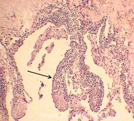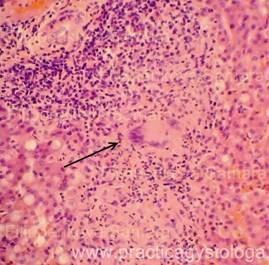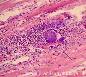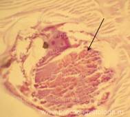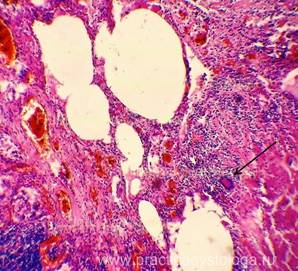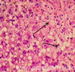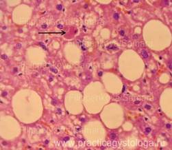 13. Состояние капсулы печени. Пример№1. ПЕЧЕНЬ (1объект) -в срезах неравномерный слабый аутолиз. Неравномерное кровенаполнение синусоидных капилляров, варьирующее от слабого и слабо-умеренного кровенаполнения их до очагового полнокровия. Полнокровие центральных вен и вен портальных трактов. Балочно-радиарное строение долек начинает стираться на фоне умеренно выраженной очагово-диффузной крупнокапельной жировой дистрофии гепатоцитов. Остальные печёночные клетки в состоянии умеренной мелкокапельной жировой дистрофии. Портальные тракты практически не расширены, в строме ряда из них очаговая умеренная лимфогистиоцитарная инфильтрация с единичными сегментоядерными лейкоцитами. Капсула печени в данных срезах не представлена. Гистологическое заключение: Умеренно выраженный жировой гепатоз. Слабо-умеренная картина хронического персистирующего гепатита. Рис.10-17. Жировой гепатоз различной степени выраженности, в отдельных срезах с очаговой вакуольной, гидропической дистрофией гепатоцитов и очагами хронического воспаления, тельцами Маллори (алкогольный гиалин, рис. 17, стрелка). Окраска: гематоксилин и эозин. Увеличение х100, х250 и х400. Одна фотография в чёрно-белом варианте.