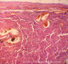 Пример№3. ЛЁГКОЕ (1объект) -диффузное венозное и капиллярное полнокровие, диапедезные микрогеморрагии, очаговые слабые интра - и экстраальвеолярные кровоизлияния насыщенно-красного цвета, на фоне небольшого количества лейкоцитов и гемосидерофагов. Участки дистелектазов лёгочной ткани чередуются с очагами острой альвеолярной эмфиземы. Слабо выраженный очаговый альвеолярный отёк. В срезах представлены единичные небольшие бронхи без признаков склероза и воспаления стенок, с тотальной десквамацией мерцательного эпителия, в просветах - слущенный эпителий. В строме единичные мелкие очаги умеренной круглоклеточной инфильтрации. Лёгочная плевра в данных срезах не представлена.
