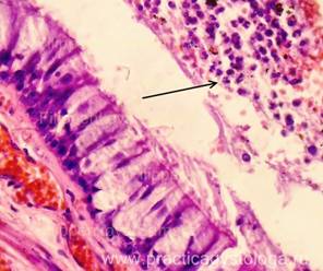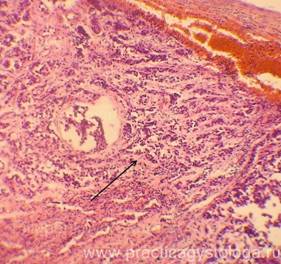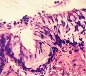 Пример№2. ЛЁГКИЕ (4объекта, с бронхами, см. наличие бронхоспазма) -диффузное венозно-капиллярное полнокровие, эритростазы, в отдельных сосудах резко выраженный внутрисосудистый лейкоцитоз. Дистония, нерезкий спазм некоторых сосудов. Диапедезные микрогеморрагии, несколько мелкоочаговых экстра - и интраальвеолярных кровоизлияний насыщенно-красного цвета, с небольшим количеством лейкоцитов. Очаги острой альвеолярной эмфиземы различной степени выраженности и распространённости, с истончением и дефектами ряда межальвеолярных перегородок. Альвеолярный отёк в срезах 3-ёх объектов слабо выраженный очаговый (мелкоочаговый), в срезах 4-ого объекта - выраженный распространённый. В отдельных полях зрения в просветах альвеол слабо-умеренные скопления гемосидерофагов, выраженный периваскулярный отёк. В срезах представлены преимущественно крупные бронхи без признаков склероза и воспаления стенок, в состоянии лёгкой дистонии, с субтотальной и тотальной десквамацией мерцательного эпителия, признаками выраженной гиперсекреции слизи (большинство бокаловидных клеток значительно набухшее, с просветлением цитоплазмы), в просветах бронхов - пласты слущенного мерцательного эпителия, большое количество тяжей слизи, умеренное количество сегментоядерных нейтрофильных лейкоцитов, небольшое количество макрофагов. Лёгочная плевра в данных срезах не представлена. Картина острого гнойного эндобронхита.