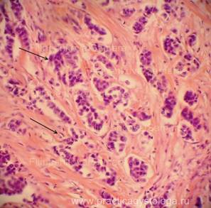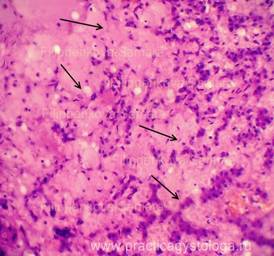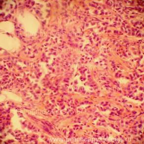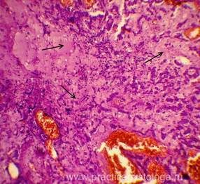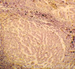 Пример№6. ПЕЧЕНЬ (1объект) - кровенаполнение синусоидных капилляров варьирует от слабого кровенаполнения до очагового умеренного их полнокровия. В зоне фиброзных тяжей умеренное полнокровие ряда небольших сосудов. Балочно-радиарное строение печёночных долек нарушено за счёт умеренного разрастания тяжей грубой фиброзной ткани различной толщины и протяжённости, со слабо выраженной очаговой круглоклеточной инфильтрацией, исходящих из склерозированных портальных трактов и зон перивенулярного склероза (вокруг центральных вен), охватывающих небольшие группы гепатоцитов в пределах одной печёночной дольки и крупные группы гепатоцитов в пределах нескольких смежных печёночных долек. Гепатоциты в состоянии выраженной белковой зернистой дистрофии, часть из них деформирована, в состоянии атрофии, с признаками регенерации в виде деления ядер и самих клеток. До 2-3% печёночных клеток подверглось крупнокапельному ожирению. Гистологическое заключение: Картина мономультилобулярного цирроза печени. Пример№7. ПЕЧЕНЬ (2объекта) -кровенаполнение синусоидных капилляров варьирует от слабого и слабо-умеренного кровенаполнения до очагового умеренного полнокровия. Балочно-радиарное строение печёночных долек на крупных участках срезов нарушено за счёт наличия крупных очагов разрастания атипичной ткани с гистологической картиной гепатоцеллюлярного рака. Мелкие очаги опухолевой ткани и небольшие группы гепатоцитов в состоянии некроза со слабо выраженным реактивным лейкоцитозом. Видны небольшие сосуды с распространением опухолевых клеток по ходу их стенок и с наличием опухолевых конгломератов в просветах (гематогенная диссеминация опухоли). Сохранившиеся гепатоциты в состоянии выраженной и резко выраженной белковой зернистой дистрофии, с признаками гипотрофии, атрофии, деформации. Небольшие очаги гидропической дистрофии гепатоцитов. До 15-20% печёночных клеток подверглось мелко- и крупнокапельному ожирению. Умеренное количество гепатоцитов с признаками их регенерации в виде деления их ядер и самих клеток. Портальные тракты слабо расширены за счёт склероза, с очаговой слабо выраженной лимфогистиоцитарной инфильтрацией. Капсула печени с неравномерным слабым и умеренным склерозом, на её поверхности слабо выраженные тонкие полосовидные наложения рыхлого фибрина. Гистологическое заключение: Гепатоцеллюлярный рак. Картина хронического персистирующего гепатита. Признаки фибринозного перитонита.