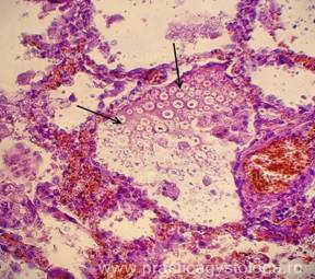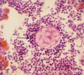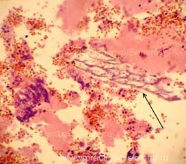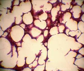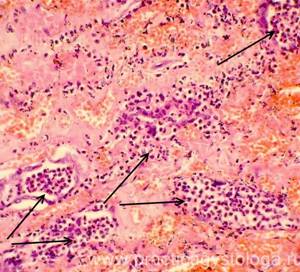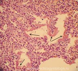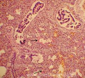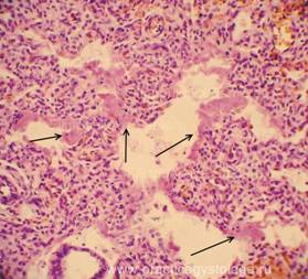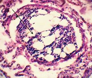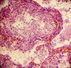 3. Наличие в просветах сосудов на фоне эритроцитов небольших округлых оптических пустот, похожих на жировые эмболы (при травме). Возможны фрагменты тканей (тканевая эмболия при травме). 4. Дистония, спазм стенок сосудов. Изменения сосудистых стенок (дистония, спазм, картина острого гнойного или продуктивного васкулита, склероз). 5. Состояние лёгочной паренхимы: - очаговая или диффузная эмфизема с указанием степени её выраженности, с образованием «птичьих шпор», указывающих на резко выраженную эмфизему при коротком агональном периоде, - частичное спадение лёгочной ткани (дистелектазы) или полное её спадение (ателектазы); - снижение или полное отсутствие воздушности лёгочной ткани при заполнении просветов альвеол воспалительным экссудатом, отёчной жидкостью, при наличии очагов казеозного некроза, пневмосклероза, разрастания атипичной ткани.