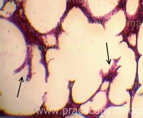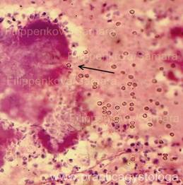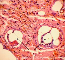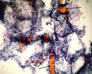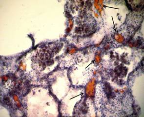 Наличие жировых эмболов в просветах сосудов лёгких можно предположить по наличию на фоне эритроцитов и других элементов крови в просветах сосудов небольших округло-овальных оптических пустот.