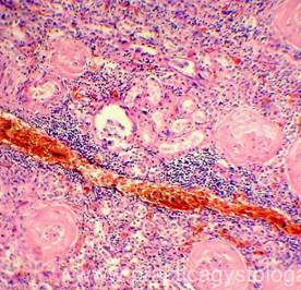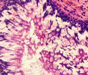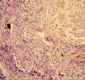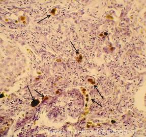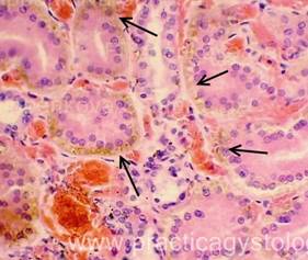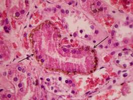 9. БИН-симптом (базальная инкрустация нефротелия) -при наличии внутрисосудистого гемолиза эритроцитов до момента физиологической смены эпителиоцитов канальцев по ходу базальной мембраны расположены пылевидные или в виде гранул отложения золотисто-жёлтого или буро-коричневого пигмента.