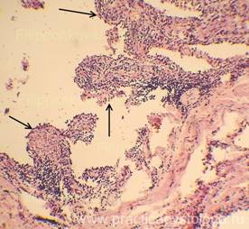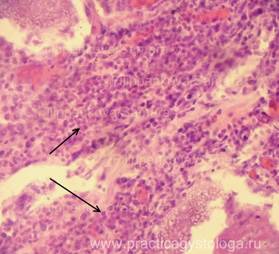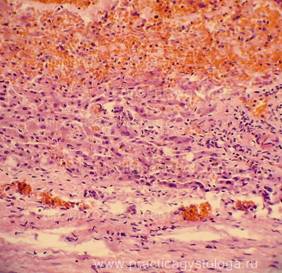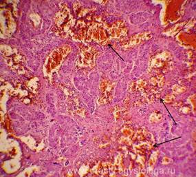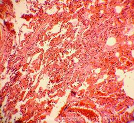 8. Кровоизлияния: мелко/средне/крупноочаговые, слабые, умеренные, выраженные, возможен их деструктивный характер, указывается цвет эритроцитов (насыщенно-красные, буровато-тёмно-красные), степень гемолиза эритроцитов, клеточная реакция (с лейкоцитозом, макрофагальной реакцией, пролиферацией фибробластов). Очаги гемосидероза (скопления гемосидерофагов в просветах альвеол - при ХСН, хронической интоксикации).