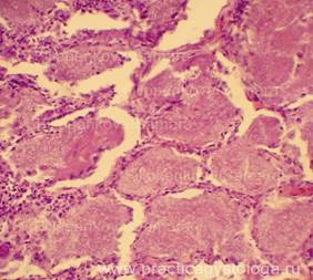 6. Состояние межальвеолярных перегородок: истончены, утолщены за счёт отёка, клеточной инфильтрации, склероза.