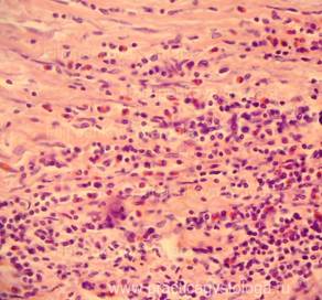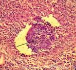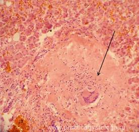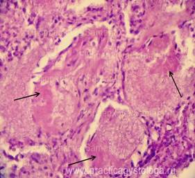 9. Состояние бронхов: наличие склероза, воспаления, дистонии, спазма стенок, что находится в просветах (слущенный эпителий, эритроциты, гемосидерофаги, инородные частицы), состояние перибронхиальной ткани (при её воспалении). 10. Состояние лёгочной плевры ( не утолщена, без признаков склероза и воспаления; в состоянии умеренного или выраженного склероза и др.). При умеренном и выраженном аутолизе уже нельзя отдифференцировать острую альвеолярную эмфизему и очаги гнилостной эмфиземы, нельзя говорить достоверно об альвеолярном отёке (может быть гнилостная жидкость). Указывается, что на фоне аутолиза оценка срезов ограничена. Пример№1. ЛЁГКИЕ (2объекта) -на всей площади срезов одного из объектов представлен казеозный некроз с большим количеством угольного пигмента, единичными мелкими кальцинатами. В других срезах - также крупный очаг казеозного некроза, окружённый грубой соединительной тканью с выраженной очаговой круглоклеточной инфильтрацией, мелкими скоплениями гигантских многоядерных клеток Пирогова-Лангганса, без признаков перифокального воспаления. Специфическое воспаление, вызванное микобактерией туберкулёза, без признаков активности процесса.