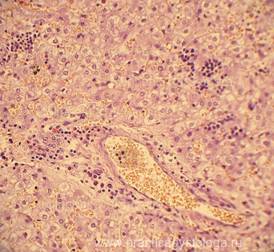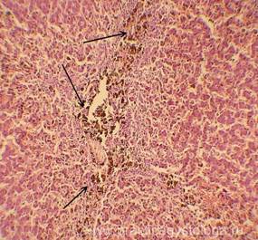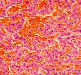 2. Нарушения реологии крови: эритростазы, лейкостазы, разделение крови на плазму и форменные элементы, плазмостазы, микротромбы, тромбы. 3. Состояние стенок вышеуказанных сосудов: склероз, плазматическое пропитывание, гиалиноз, некроз, васкулит острый гнойный, продуктивный или полиморфноклеточный. Наличие периваскулярного склероза вокруг центральных вен (перивенулярный склероз, характерно для алкогольной печени).