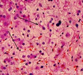 8. Некрозы гепатоцитов (мелких групп клеток, мелко/среднеочаговые в пределах дольки, мостовидные - перекидывающиеся с дольки на дольку, мультилобулярные - захватывающие несколько смежных долек).