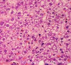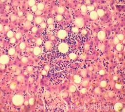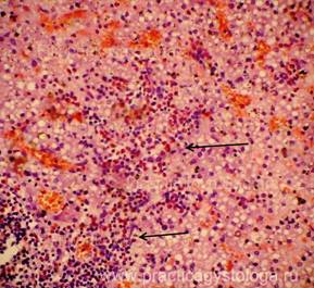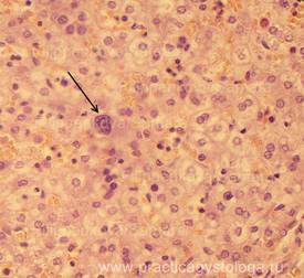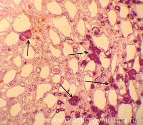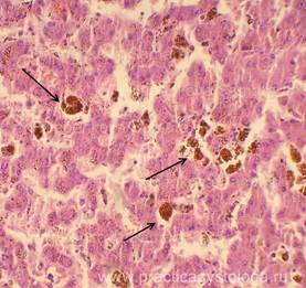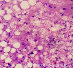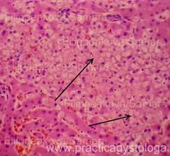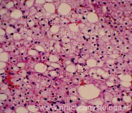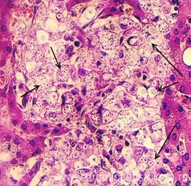 5. Балочно-радиарное строение печёночных долек: - сохранено, чёткое, прослеживается; - стёрто при наличии умеренного, выраженного жирового гепатоза, мелкоочаговых некрозов; - нарушено при наличии мостовидных (перекидывающихся с дольки на дольку) и мультилобулярных некрозов, картины неполного септального, моно - и мультилобулярного, смешанного цирроза печени, крупных очагов фиброза. 6. Наличие клеток Краевского (гепатоциты с признаками мобилизации гликогена, значительно набухшие, с просветлённой цитоплазмой, полигональной формы, расположены компактно, в виде «булыжной мостовой»). 7. Дистрофические изменения гепатоцитов: белковая зернистая дистрофия, вакуольная дистрофия, гидропическая дистрофия, жировая дистрофия (диссеминированная, мелкоочаговая, средне - и крупноочаговая, умеренная и выраженная диффузная, субтотальная, тотальная).