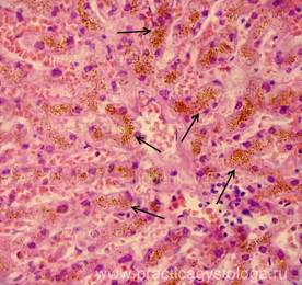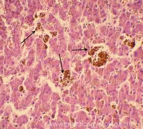 Пример№2. ПЕЧЕНЬ (1объект) -в срезах диффузный слабо выраженный аутолиз. Очагово-диффузное выраженное полнокровие синусоидных капилляров. Полнокровие центральных вен и вен портальных трактов. Балочно-радиарное строение долек чёткое. Цитоплазма гепатоцитов зернистого вида, без признаков жировой дистрофии. Портальные тракты не расширены, в строме единичных из них очень слабая лимфогистиоцитарная инфильтрация, единичные мелкие круглоклеточные инфильтраты обнаружены в строме долек. Начальный склероз стенок артерий триад. Капсула печени в данных срезах не представлена. Гистологическое заключение: Очень слабо выраженные признаки хронического персистирующего гепатита. Пример№3. ПЕЧЕНЬ (2объекта) -слабое кровенаполнение синусоидных капилляров (капилляры сдавлены дистрофически изменёнными гепатоцитами). Единичные мелкоочаговые диапедезно-деструктивные кровоизлияния насыщенно-красного цвета, с небольшим количеством лейкоцитов. Просветы центральных вен преимущественно пустые. Полнокровие ряда вен портальных трактов. Балочно-радиарное строение долек стёрто на фоне выраженной очагово-диффузной крупнокапельной жировой дистрофии гепатоцитов и выраженной их гидропической дистрофии. Небольшие группы сохранившихся печёночных клеток с признаками деления ядерного материала. Отдельные портальные тракты слабо расширены, в их строме диффузная слабо-умеренная лимфогистиоцитарная инфильтрация, единичные сегментоядерные лейкоциты. Капсула печени не утолщена. Гистологическое заключение: Выраженный жировой гепатоз с выраженной очаговой гидропической дистрофией гепатоцитов. Слабо-умеренная картина хронического персистирующего гепатита.