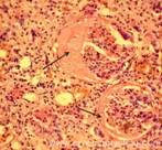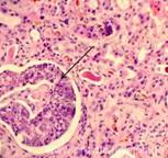 5. Состояние почечных клубочков (строение их сохранено, клубочки в состоянии атрофии, склероза, гиалиноза, с наличием склероза капсулы Шумлянского-Боумена различной степени выраженности, с наличием в просвете капсулы Шумлянского гомогенной бледно-розовой жидкости и слабо-зернистых бледно-розовых масс).