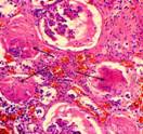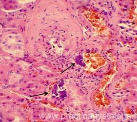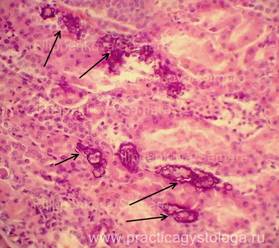 8. Наличие канальцев в состоянии нефрокальциноза (эпителиоциты инкрустированы солями кальция или в просветах канальцев наличие мелких кальцинатов) - чаще всего имеет постнекротический генез, также может быть проявлением гиперкальциемии. Нефрокальциноз - 1. инкрустация эпителиоцитов канальцев солями кальция, чаще всего исход некроза эпителиоцитов; 2. в просветах канальцев видны включения мелких кальцинатов (характерно для гиперкальциемии); 3. смешанный вариант.