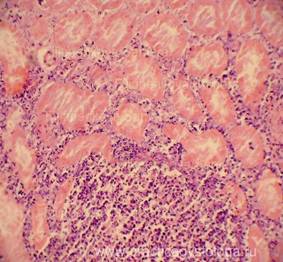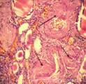 7. Наличие очагов некроза почечной ткани (некронефроза), реактивная клеточная реакция, степень её выраженности.