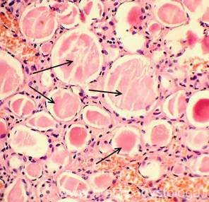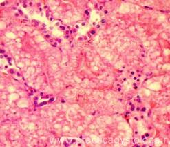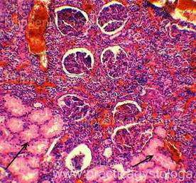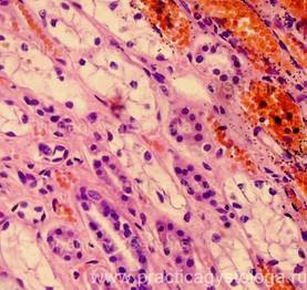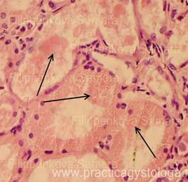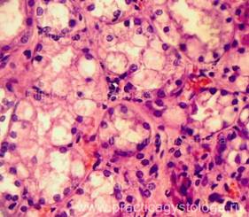 7. Состояние эпителия почечных канальцев: - белковая зернистая дистрофия различной степени выраженности; - вакуольная (мелко/средне/крупновакуольная) дистрофия (по ходу базальной мембраны канальцев или во всём объёме цитоплазмы эпителиоцитов расположены белесоватые вакуоли); - гиалиново-капельная дистрофия различной степени выраженности; - гидропическая, водяночная дистрофия различной степени выраженности, вплоть до максимальной степени её выраженности - баллонной дистрофии (эпителиоциты значительно набухшие, с выраженным просветлением цитоплазмы); - некробиозы-некрозы отдельных эпителиоцитов, групп клеток, целых канальцев (ядра не видны, границы между клетками не прослеживаются).
