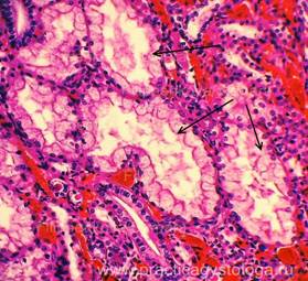10. Признаки атрофии канальцев в виде истончения эпителия, расширения просветов (вплоть до очагов «щитовидной почки»).