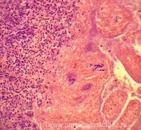 Пример№1. СТЕНКА ЖЕЛУДКА (2объекта) -выраженное диффузное венозно-капиллярное полнокровие всех слоёв стенки желудка, просветы сосудов расширены, переполнены кровью, с эритростазами, внутрисосудистым лейкоцитозом, пристеночным стоянием лейкоцитов, диапедезными кровоизлияниями. Стенки ряда сосудов с картиной острого гнойного и гнойно-некротического васкулита. Явление внутрипросветного и пристеночного тромбоза. В срезах представлены резко изменённая слизистая оболочка: утолщена, с субтотальным её некрозом, выраженной реактивной лейкоцитарной инфильтрацией, наличием мелких колоний бактериальной микрофлоры, в одном из объектов - резко выраженные очагово-диффузные деструктивные кровоизлияния тёмно-красного и буро-коричневого цвета, с неравномерно выраженным гемолизом эритроцитов на фоне лейкоцитарной инфильтрации. Подслизистая основа резко утолщена, разрыхлена, разволокнена за счёт отёка, с выраженными кровоизлияниями деструктивного характера, с лейкоцитарной инфильтрацией, сливающимися друг с другом, распространяющимися частично на мышечную оболочку. Видны мелкие и средней величины очаги некроза мышечной оболочки с лейкоцитарной инфильтрацией. Серозная оболочка умеренно утолщена, разрыхлена, с немногочисленными сегментоядерными нейтрофильными лейкоцитами, очаговыми тонкими наложениями рыхлого фибрина.