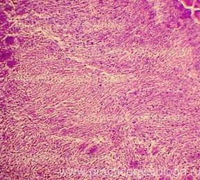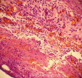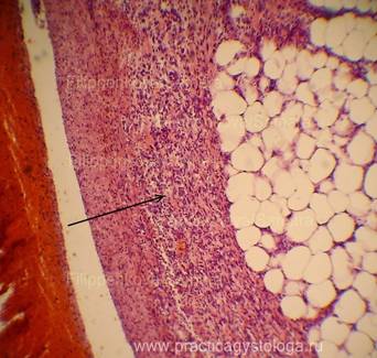 3. Состояние слизистой оболочки (утолщена, истончена, с отёком стромы, наличие некрозов, очаговых или диффузных острой лейкоцитарной инфильтрации, продуктивного воспаления различной степени выраженности, наличие кровоизлияний различного типа и распространенности, клеточная реакция в них, пятна Вишневского - в различных стадиях). 4. Состояние подслизистой основы (утолщена, разрыхлена за счёт отёка, очаговых или диффузных острой лейкоцитарной инфильтрации, продуктивного воспаления различной степени выраженности, с кровоизлияниями различного типа и распространенности, клеточная реакция в них). 5. Состояние мышечной оболочки (в состоянии отёка, с клеточной инфильтрацией, некрозами, кровоизлияниями, замещением гладких мышечных клеток склерозом или атипичной тканью). 6. Состояние серозной оболочки (утолщена, с наличием очаговых или диффузных острой лейкоцитарной инфильтрации, продуктивного воспаления различной степени выраженности, наличие кровоизлияний различного типа и распространенности, клеточная реакция в них, наличие наложений крови, фибрина, гнойно-фибринозного экссудата, наличие туберкулёзных гранулём, гигантских многоядерных макрофагов - клеток Пирогова-Лангганса или клеток инородных тел и др.).