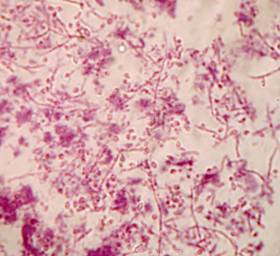Рис. 1-4. Грибковое поражение пищевода, предположительно, кандидозной природы. Слизистая оболочка в состоянии некроза, практически не прослеживается, на её месте выраженное разрастание мицелия гриба с наличием дрожжеподобных округло-овальных тел. Мицелярные нити (гифы) тянутся от базальной мембраны в виде густого «частокола». В подслизистой основе и частично в мышечной оболочке на фоне резко выраженного отёка, между утолщенными, разрыхленными, расщеплёнными соединительнотканными волокнами расположены элементы гриба, макрофаги, фибробласты и круглоклеточные элементы. Окраска: гематоксилин и эозин. Увеличение х 100, х 250, х 400. Отдельные микрофотографии проведены при закрытой диафрагме (1, 2, 4), элементы гриба в них отблескивают.