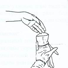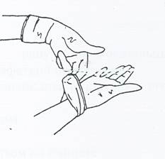 1. Взять перчатки в стерильной упаковке, развернуть. 2. Взять перчатку для правой руки за отворот так, чтобы пальцы не касались внутренней поверхности перчатки. 3. Сомкнуть пальцы правой руки и ввести их в перчатку. 4. Надеть перчатку, не нарушая ее отворота, разомкнув пальцы правой руки. 5. Взять перчатку для левой руки вторым, третьим и четвертыми пальцами правой руки (в перчатке) за отворот так, чтобы пальцы не касались внутренней поверхности перчатки. 6. Сомкнуть пальцы левой руки и ввести их в перчатку. 7. Расправить отвороты на левой, затем правой перчатке, натянув их на рукав.